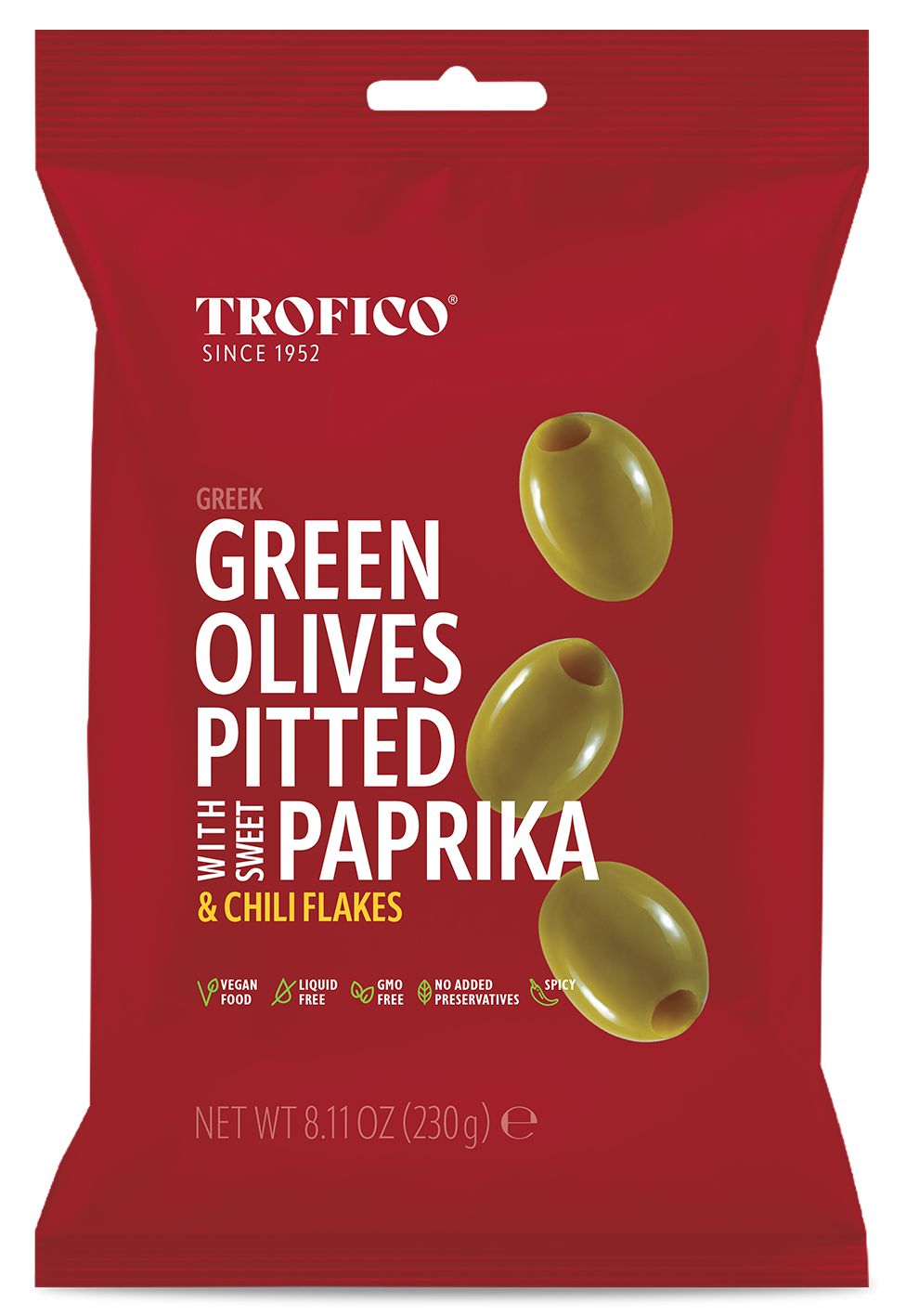 A bold flavour combination of our green olives with sweet paprika and chili flakes, provides an irresistible fiery flair to any culinary creation.